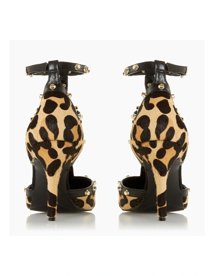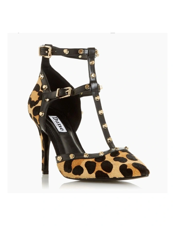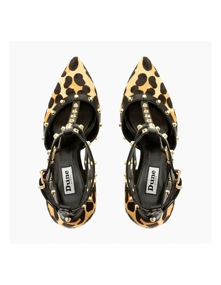 Make a statement with the stylish Clea court shoe from Dune. Featuring a striking print accented with gold-toned studs on the straps. It’s finished with a sleek pointed toe and rests on a medium stiletto heel.