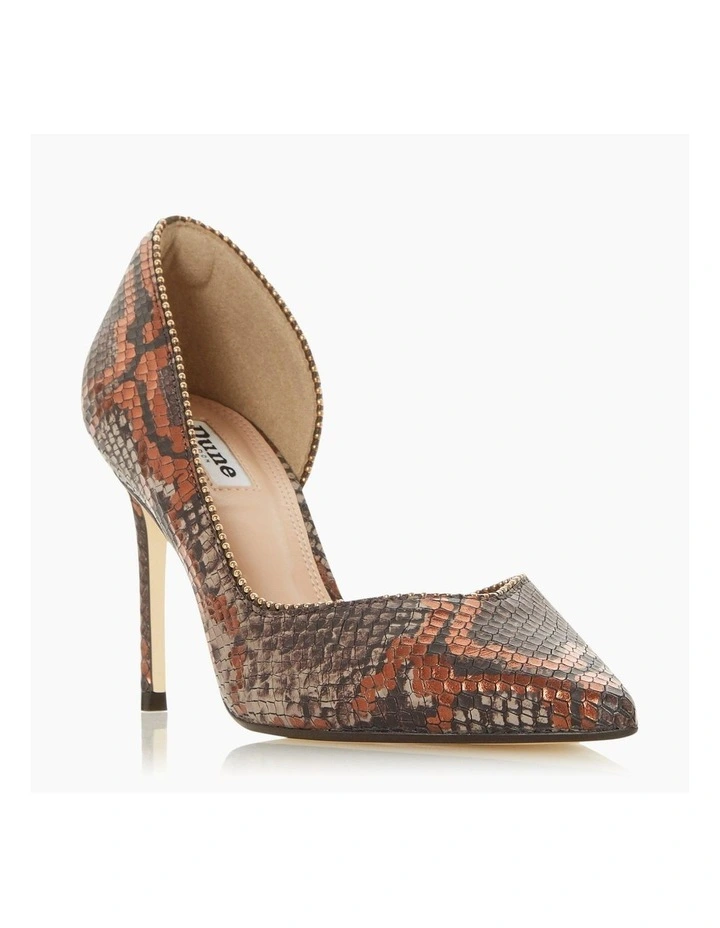 Compliment formal looks with the Dream court shoe from Dune. Cut from suede it’s shaped with a pointed toe. While gold metal embellishments decorate it.