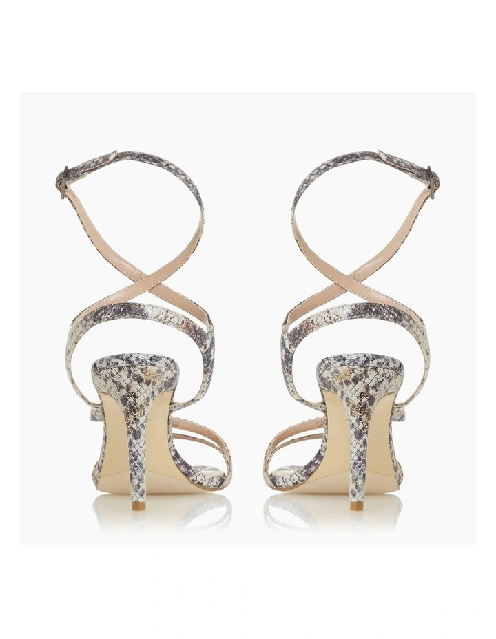 Complete your evening look with the Mighteys sandal from Dune London. In a comfortable slip on design and shaped with an open square toe. Complete with elegant ankle straps and rests on a sleek high stiletto heel.