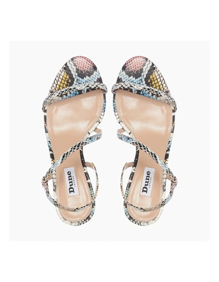The Mojo by Dune London sandal is a simple yet stylish summer option. Showcasing an asymmetric foot strap with a slingback fastening. It features an open sandal toe and rests on a mid stiletto heel.