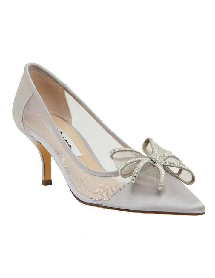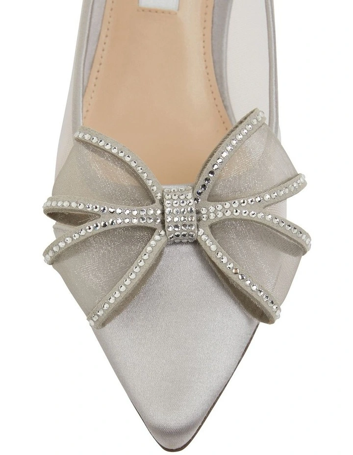 From red carpet to evening looks, BRITE features feminine aesthetics perfect for elegant dressing. The point toe silhouette is adorned with a crystal embellished bow, mesh side panels for a barely there effect, and then set on a slender heel.Β