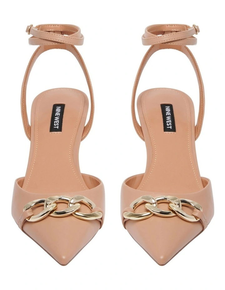 Step into new season style with the Arnice Pump. Update your wardrobe essentials with this pointed toe, open back silhouette. Featuring a plush footbed and mid height stiletto heel for ultimate comfort, the adjustable wrap around ankle strap fastening keeps you secure yet stylish for an all-day wear. Resting on the pointed toe is a chunky chain detail, creating a dose of joy within this statement heel. Arnice will look elegantly chic peeing out of relaxed tailoring or paired with a midi skirt and blazer.
