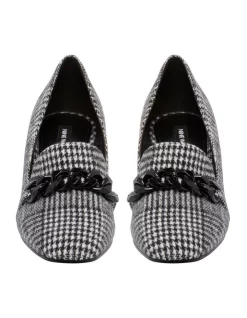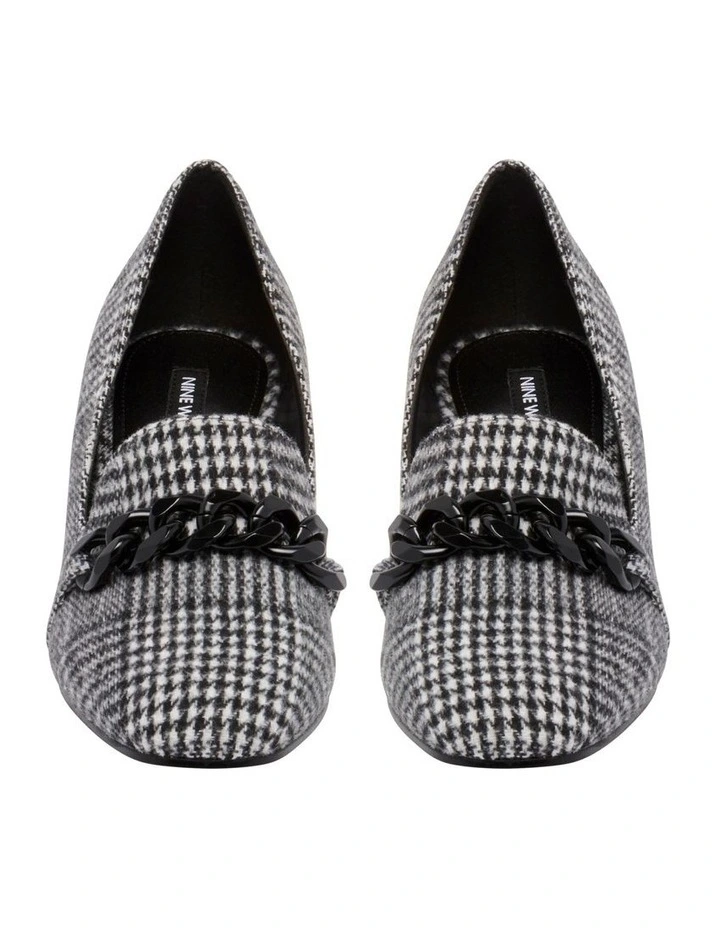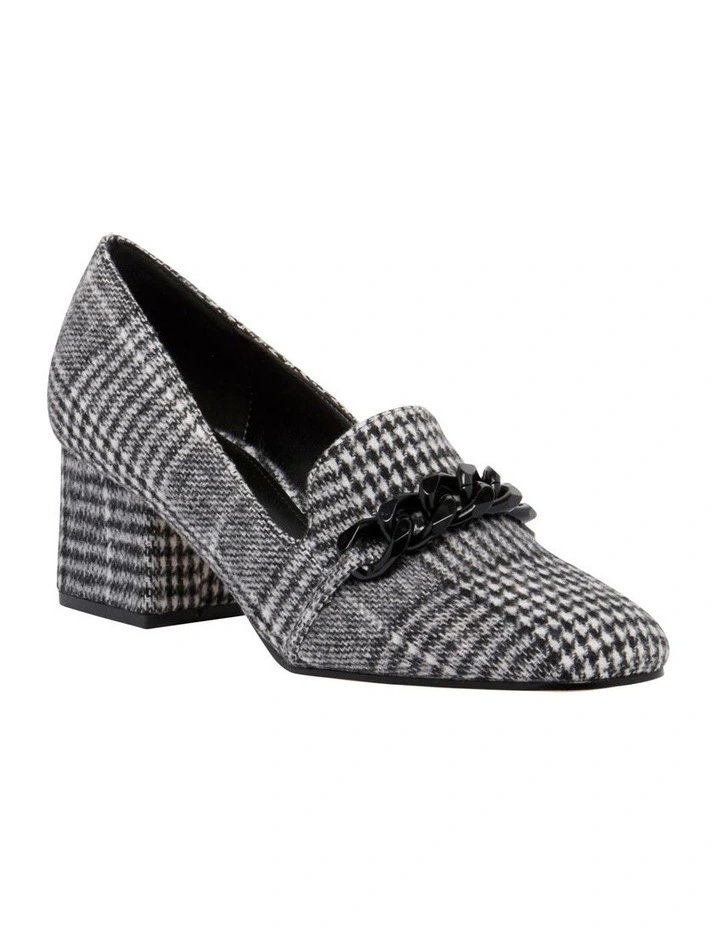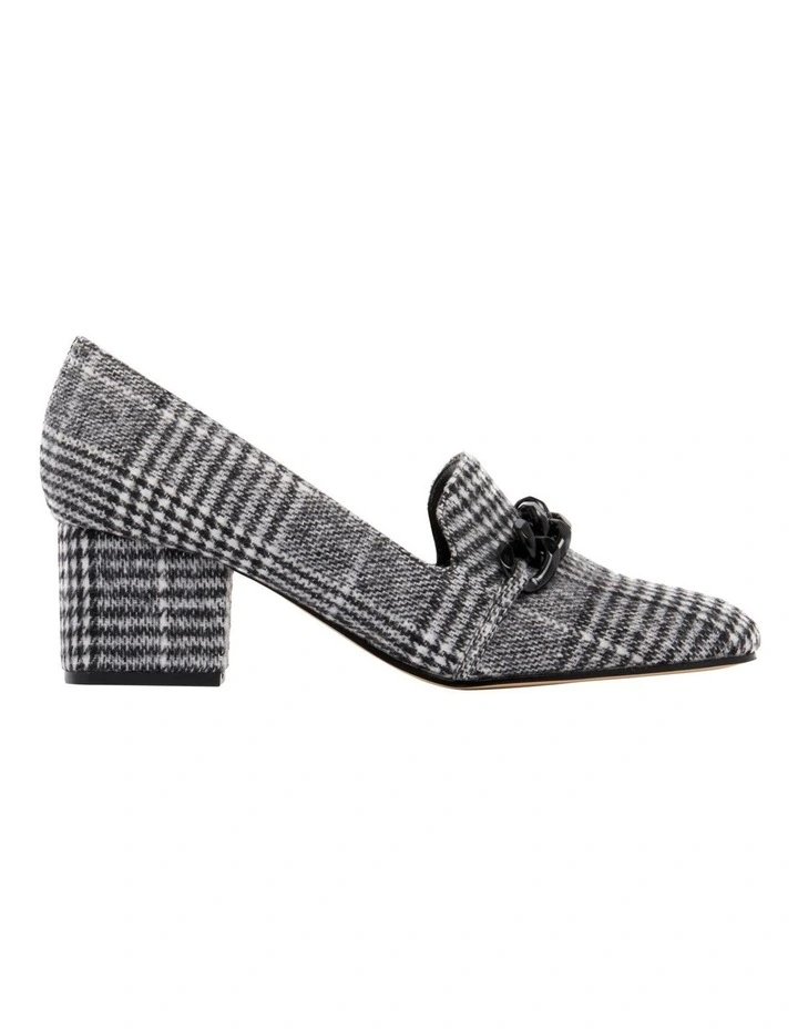 The Remal pump collides a classic loafer silhouette with a block heel design. Comprised of a softly square toe, sturdy block heel, comfortable footbed and closed back, Remal is easy to wear while stylishly elevating almost any look. The chunky chain detail resting on the top of the toe, creates an eye-catching gaze while creating a two-texture depth to this timeless staple.