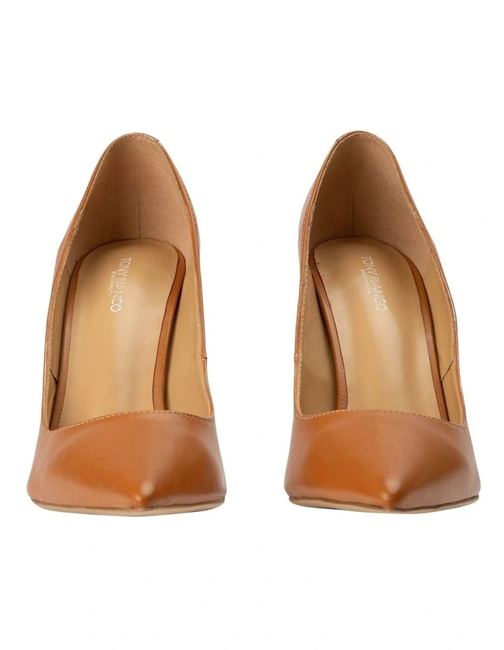 Be bold with a gold heel this season. Introducing the tan leather Aviva steel heel pump. Donning a classic closed pointed-toe, scooped upper and forever timeless court shoe silhouette, there is something for everyone in this style.