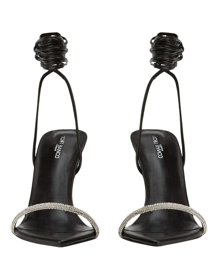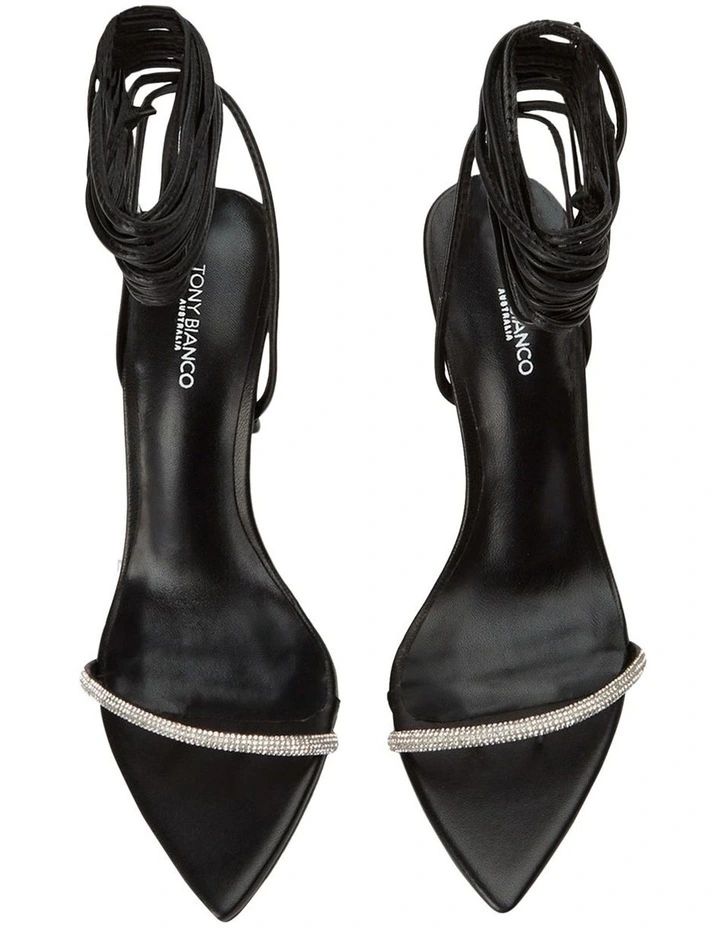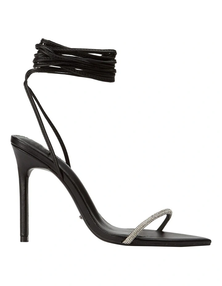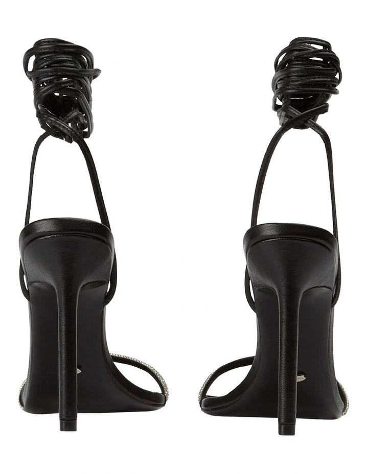 Make it your moment in the Makai bling stiletto black heels. Showcasing the best-selling tie-up ankle strap, sleek elongated sole and embellished toe-strap, this subtle diamante style is ready to be your next treasure.