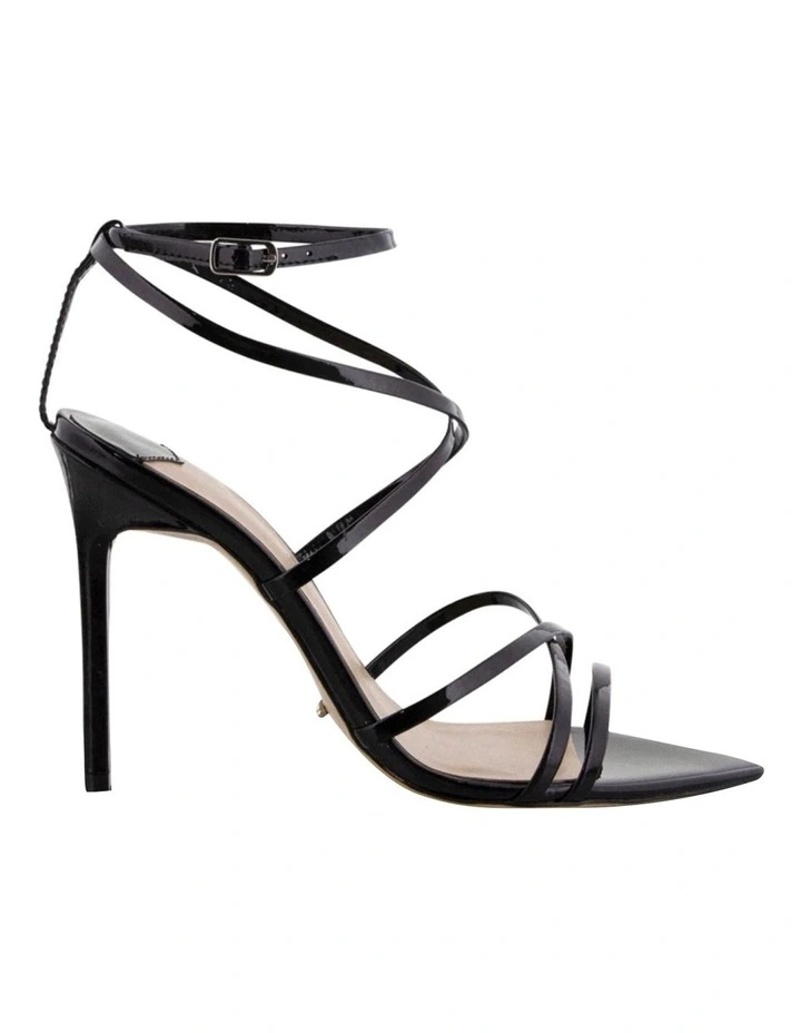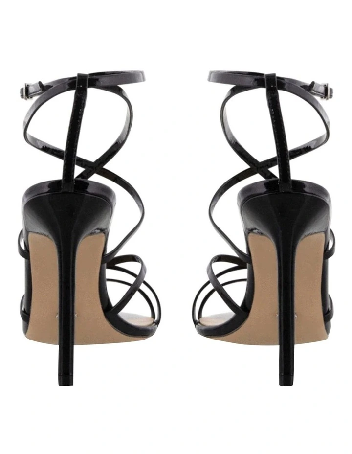 The black patent Marcy stiletto heel features a pointed open toe shape with slender multiple cross over straps and adjustable ankle buckle.